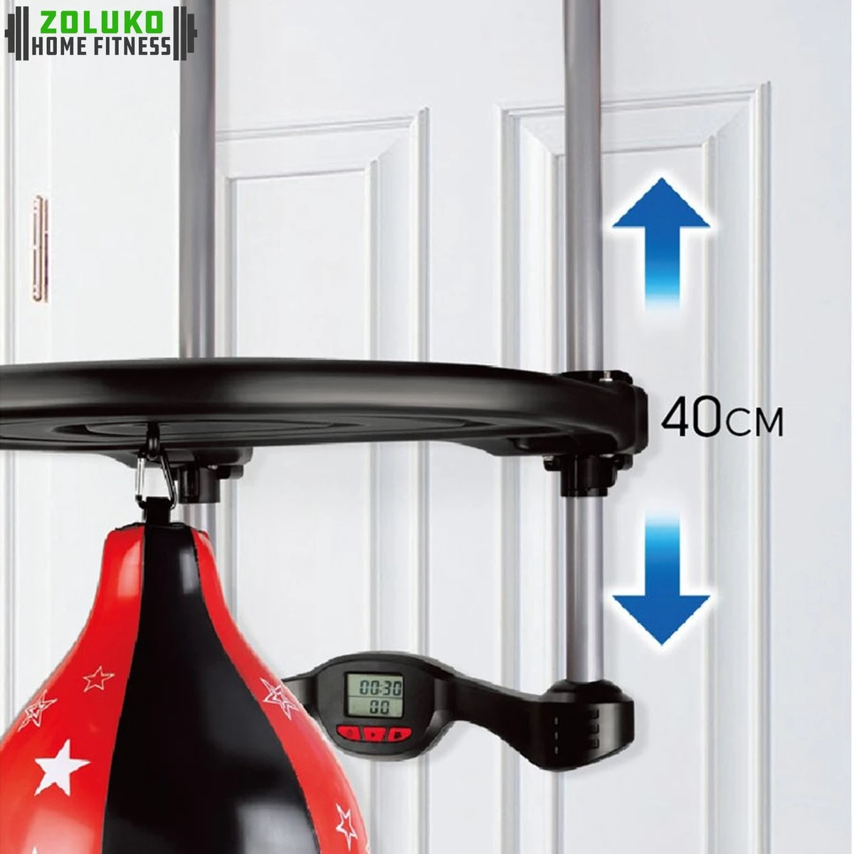 Met de boksbal met timer van Zoluko heb je geen gedoe met gaten boren, want de boksbal kun je overal ophangen. Dankzij de flexibele ophangbeugels is de boksbal te gebruiken voor ieder type deur. Binnen en buiten. Daarnaast kan de boksbal met timer in hoogte versteld worden tot 40 cm door de bovenplaat te verschuiven over de 2 buizen.