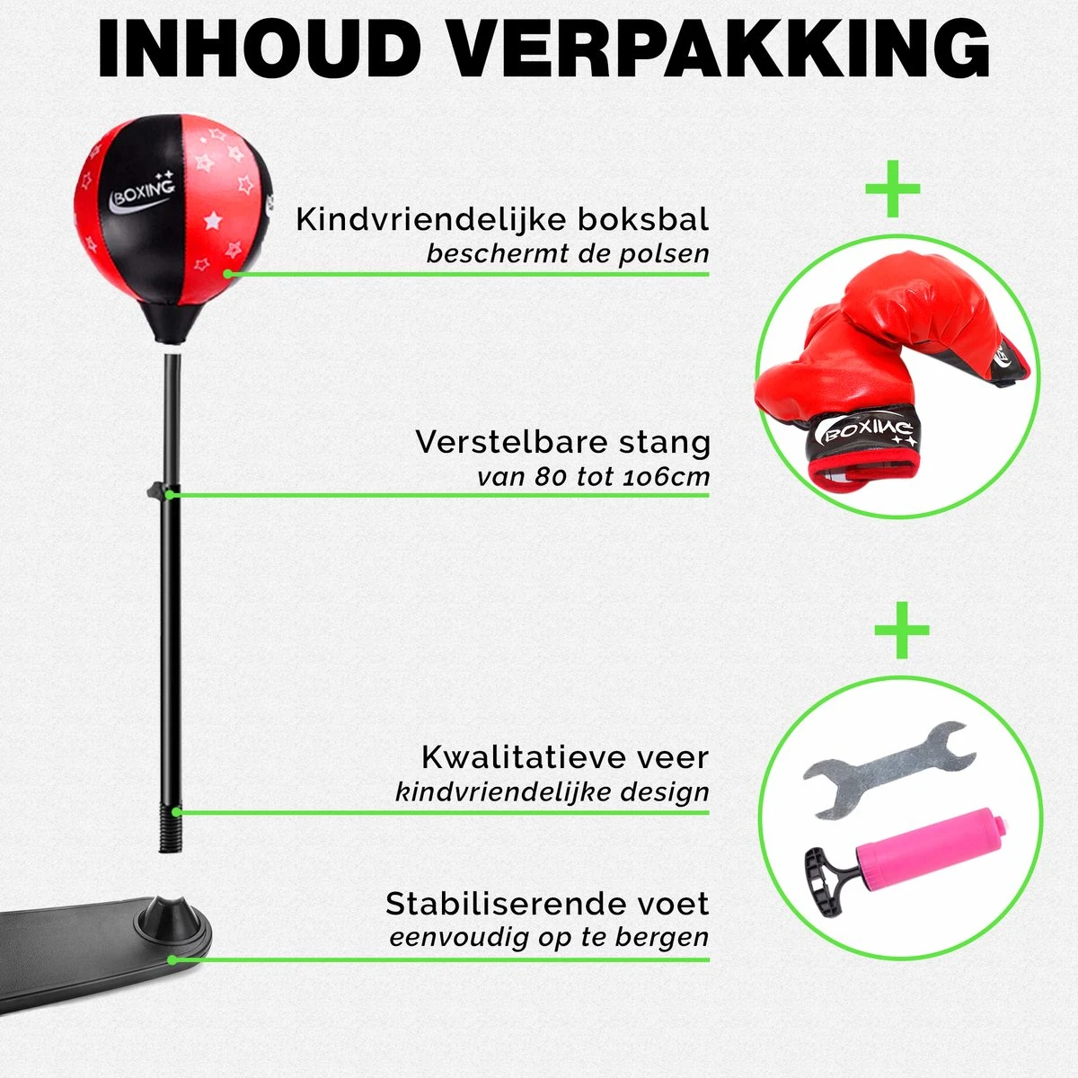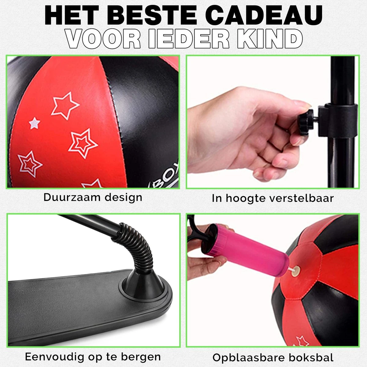 Verras je kind met deze fantastische boksset! Deze boksset voor kinderen is uitermate geschikt om hun reactievermogen, snelheid en coördinatie te trainen. Geen gedoe met ophangen, want de boksbal op standaard kun je overal neerzetten. De boksset biedt niet alleen een gezonde activiteit aan, maar je kind zal ook veel plezier beleven aan het spelen met deze boksset!